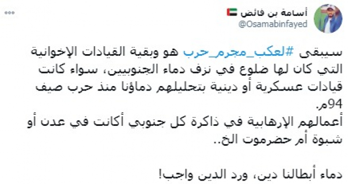 أكد الكاتب الإعلامي أسامة بن فائض، أن القيادي الإخواني الإرهابي المدعو لعكب مجرم حرب متورط في دماء الجنوبيين.