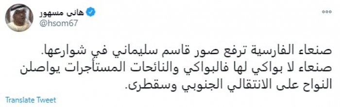 وقال في تغريدة عبر "تويتر" رصدها "المشهد العربي": "صنعاء الفارسية ترفع صور قاسم سليماني في شوارعها".