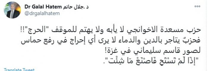 وقال في تغريدة عبر "تويتر" رصدها "المشهد العربي": "حزب مسعدة الإخوانجي لا يأبه ولا يهتم للموقف الحرج.. فحزبٌ يتاجر بالدين والدماء لا يرى أي إحراج في رفع حماس لصور قاسم سليماني في غزة".