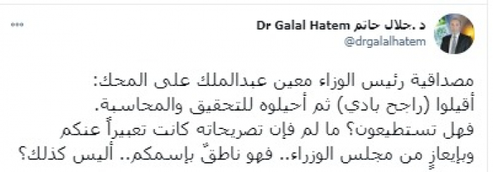 وكتب "حاتم" تغريدة عبر حسابه بتويتر، رصدها "المشهد العربي": "مصداقية رئيس الوزراء معين عبدالملك على المحك: أقيلوا (راجح بادي) ثم أحيلوه للتحقيق والمحاسبة".