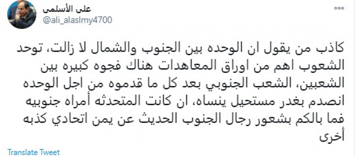 وكتب في تغريدة عبر "تويتر" رصدها "المشهد العربي": "كاذب من يقول أن الوحدة بين الجنوب والشمال لا زالت، توحد الشعوب أهم من أوراق المعاهدات هناك فجوة كبيرة بين الشعبين".