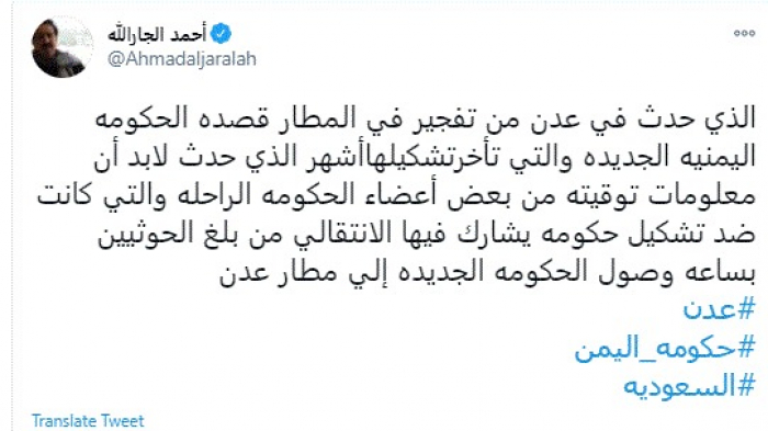 وكتب في تغريدة عبر "تويتر" رصدها "المشهد العربي": "الذي حدث في عدن من تفجير في المطار قصده الحكومة اليمنية الجديدة والتي تأخر تشكيلها أشهر".