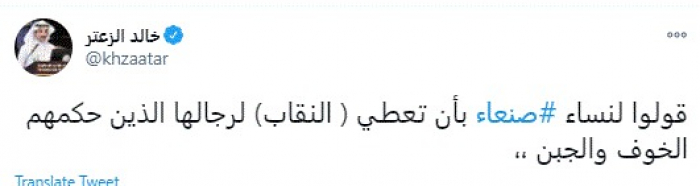 وقال في تغريدة عبر "تويتر" رصدها "المشهد العربي": "قولوا لنساء صنعاء بأن تعطي (النقاب) لرجالها الذين حكمهم الخوف والجبن".