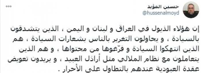 وشدد في تغريدة على حسابه بموقع التدوين المصغر تويتر، اليوم على أن: "هؤلاء الذيول في العراق ولبنان واليمن، الذين يتشدقون بالسيادة، ويحاولون التغرير بالناس بشعارات السيادة هم الذين انتهكوا السيادة وفرّغوها من محتواها".