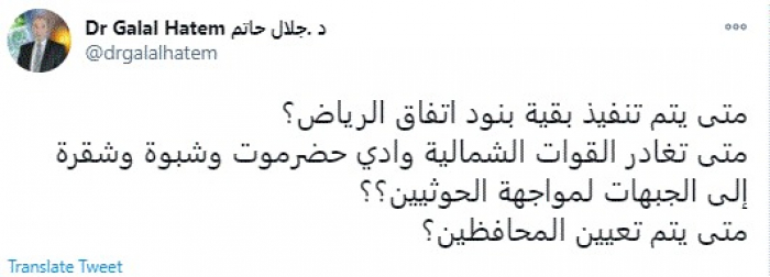 وقال في تغريدة عبر "تويتر" رصدها "المشهد العربي": "متى يتم تنفيذ بقية بنود اتفاق الرياض؟".