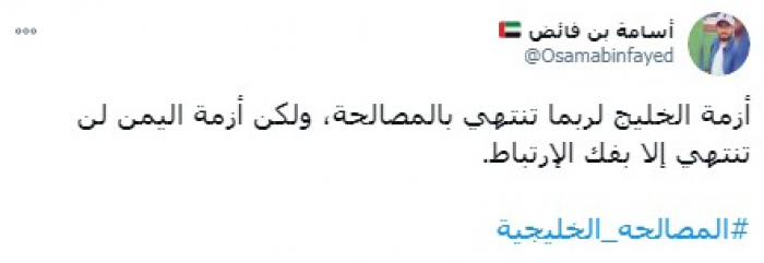 وأكد في تغريدة على حسابه بموقع التدوين المصغر تويتر، اليوم أن: "أزمة الخليج لربما تنتهي بالمصالحة، ولكن أزمة اليمن لن تنتهي إلا بفك الإرتباط".