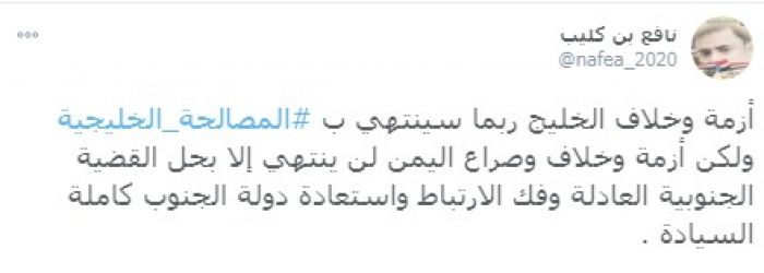 وأوضح: "لكن أزمة وخلاف وصراع اليمن لن ينتهي إلا بحل القضية الجنوبية العادلة وفك الارتباط واستعادة دولة الجنوب كاملة السيادة".