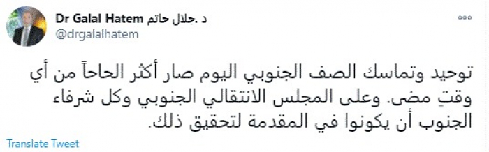 وكتب في تغريدة عبر "تويتر" رصدها "المشهد العربي": "توحيد وتماسك الصف الجنوبي اليوم صار أكثر الحاحًا من أي وقتٍ مضى".