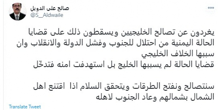 الدويل لـ الشماليين: السلام سيتحقق في حال عودة الجنوب لأهله