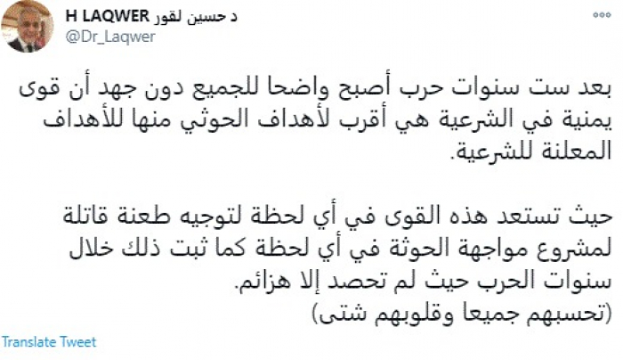 لقور يُحذر من توجيه قوى بالشرعية لطعنة قاتلة لمشروع مواجهة الحوثي