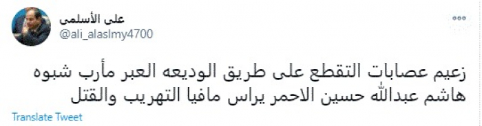 وقال في تغريدة عبر "تويتر" رصدها "المشهد العربي": "زعيم عصابات التقطع على طريق الوديعة العبر مأرب شبوة هاشم عبدالله حسين الأحمر يرأس مافيا التهريب والقتل".