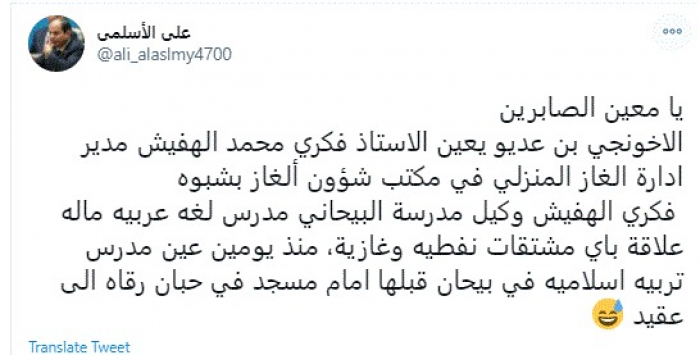 وقال في تغريدة عبر "تويتر" رصدها "المشهد العربي": "يا معين الصابرين الإخونجي بن عديو يعين الأستاذ فكري محمد الهفيش مدير إدارة الغاز المنزلي في مكتب شؤون الغاز بشبوة".