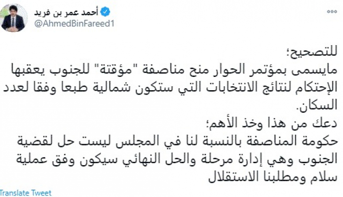 وكتب في تغريدة عبر "تويتر" رصدها "المشهد العربي": "للتصحيح؛ ما يسمى بمؤتمر الحوار منح مناصفة مؤقتة للجنوب يعقبها الإحتكام لنتائج الانتخابات التي ستكون شمالية طبعًا وفقًا لعدد السكان".