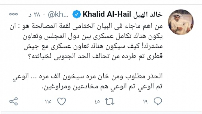 وقال في تغريدة على حسابه بموقع التدوين المصغر تويتر اليوم إن: "من أهم ما جاء فى البيان الختامى لقمة المصالحة هو : أن يكون هناك تكامل عسكرى بين دول المجلس وتعاون مشترك!".