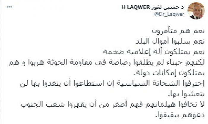 وقال في تغريدة على حسابه بموقع التدوين المصغر تويتر، اليوم: "نعم هم متآمرون، نعم سلبوا أموال البلد، نعم يمتلكون آلة إعلامية ضخمة لكنهم جبناء لم يطلقوا رصاصة في مقاومة الحوثة هربوا وهم يمتلكون إمكانات دولة".