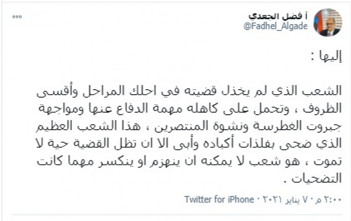 وكتب "الجعدي" تغريدة عبر حسابه بتويتر، رصدها "المشهد العربي": "الشعب الذي لم يخذل قضيته في أحلك المراحل وأقسى الظروف، وتحمل على كاهله مهمة الدفاع عنها ومواجهة جبروت الغطرسة ونشوة المنتصرين، هذا الشعب العظيم الذي ضحى بفلذات أكباده وأبى إلا أن تظل القضية حية لا تموت ، هو شعب لا يمكنه أن ينهزم او ينكسر مهما كانت التضحيات" .