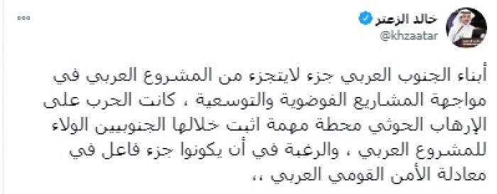 وشدد في تغريدة على حسابه بموقع التدوين المصغر تويتر، اليوم على أن: "أبناء الجنوب العربي جزء لا يتجزأ من المشروع العربي في مواجهة المشاريع الفوضوية والتوسعية".