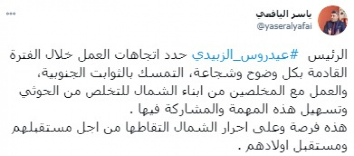 وأكد في تغريدة على حسابه بموقع التدوين المصغر تويتر، اليوم أن: "الرئيس عيدروس الزُبيدي حدد اتجاهات العمل خلال الفترة المقبلة بكل وضوح وشجاعة".
