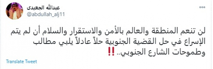 وقال في تغريدة عبر "تويتر" رصدها "المشهد العربي": "لن تنعم المنطقة والعالم بالأمن والاستقرار والسلام أن لم يتم الإسراع في حل القضية الجنوبية حلًا عادلًا يلبي مطالب وطموحات الشارع الجنوبي".