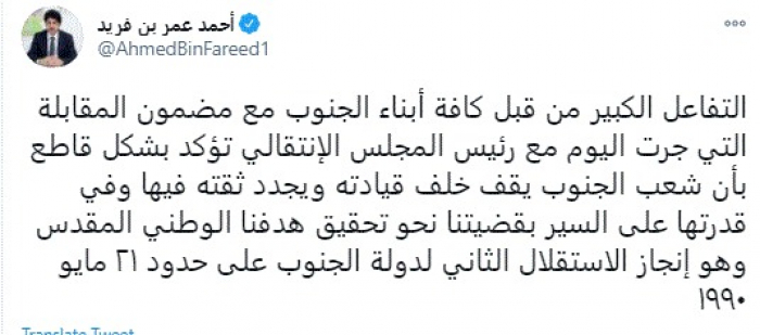 وقال في تغريدة عبر "تويتر" رصدها "المشهد العربي": "التفاعل الكبير من قبل كافة أبناء الجنوب مع مضمون المقابلة التي جرت مع رئيس المجلس الانتقالي تؤكد بشكل قاطع بأن شعب الجنوب يقف خلف قيادته ويجدد ثقته فيها وفي قدرتها على السير بقضيتنا نحو تحقيق هدفنا الوطني المقدس وهو إنجاز الاستقلال الثاني لدولة الجنوب على حدود 21 مايو 1990".