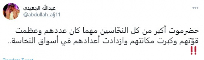 وكتب في تغريدة عبر "تويتر" رصدها "المشهد العربي": "حضرموت أكبر من كل النخّاسين مهما كان عددهم وعظمت قوّتهم وكبرت مكانتهم وازدادت أعدادهم في أسواق النخاسة".