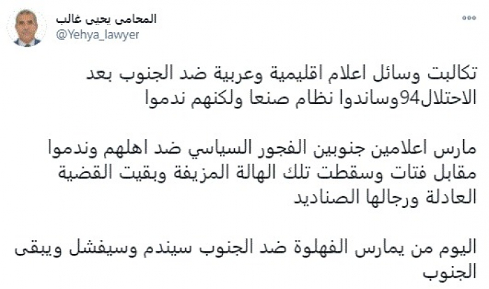 وجه الناشط السياسي المحامي يحيى غالب، اليوم، رسالة نارية للإعلاميين المعادين للجنوب.