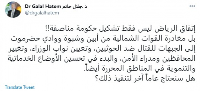 جلال حاتم يدعو لاستكمال تطبيق اتفاق الرياض