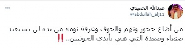 وشدد في تغريدة على حسابه بموقع التدوين المصغر تويتر، اليوم على أن: "من أضاع حجور ونهم والجوف وغرفة نومه من يده لن يستعيد صنعاء وصعدة التي هي بأيدي الحوثيين".