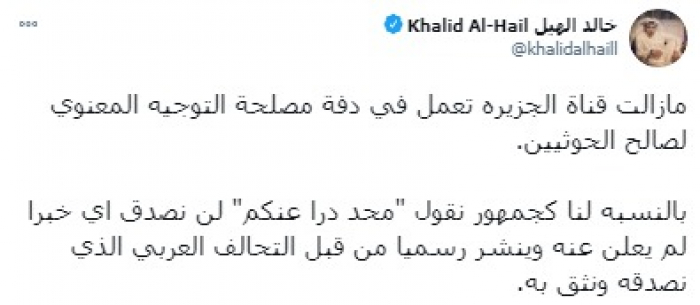 ونبه في تغريدة على حسابه بموقع التدوين المصغر تويتر، إلى أنه: "مازالت قناة الجزيره تعمل في دفة مصلحة التوجيه المعنوي لصالح الحوثيين".