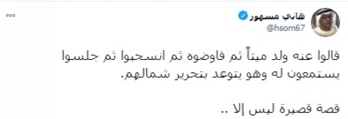 وقال في تغريدة على حسابه بموقع التدوين المصغر تويتر، اليوم إنهم: "قالوا عنه ولد ميتا ثم فاوضوه ثم انسحبوا ثم جلسوا يستمعون له وهو يتوعد بتحرير شمالهم"، مختتما: "قصة قصيرة ليس إلا".