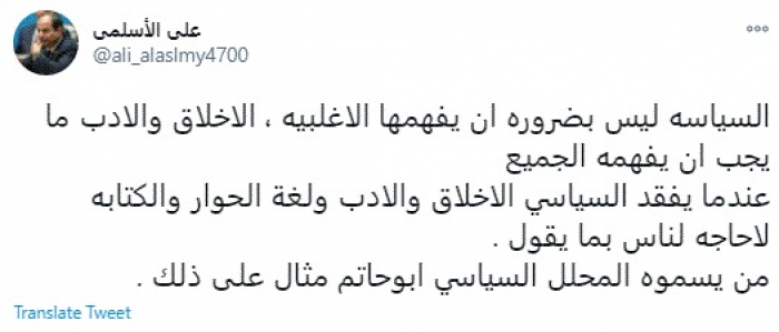 وقال في تغريدة عبر "تويتر" رصدها "المشهد العربي": "السياسة ليس بضرورة أن يفهمها الأغلبية، الأخلاق والأدب ما يجب أن يفهمه الجميع".