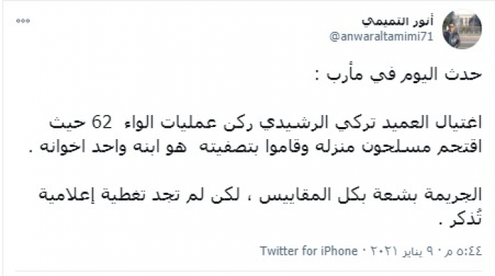 وكتب "التميمي" تغريدة عبر حسابه بتويتر، رصدها "المشهد العربي": "حدث اليوم في مأرب: اغتيال العميد تركي الرشيدي ركن عمليات اللواء 62 حيث اقتحم مسلحون منزله وقاموا بتصفيته هو وإبنه وأحد إخوانه" .