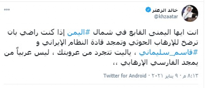 وكتب "الزعتر" تغريدة عبر حسابه بتويتر، رصدها "المشهد العربي": "أنت أيها اليمني القابع في شمال اليمن، إذا كنت راضيًا بأن ترضخ للإرهاب الحوثي وتمجد قادة النظام الإيراني وقاسم سليماني، ياليت تتجرد من عروبتك".