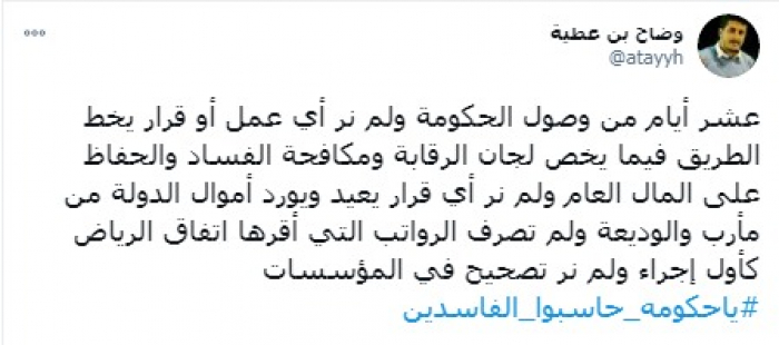 وتابع: "ولم نر أي قرار يعيد ويورد أموال الدولة من مأرب والوديعة، ولم تصرف الرواتب التي أقرها اتفاق الرياض كأول إجراء ولم نر تصحيحا في المؤسسات"، مختتما: "يا حكومة حاسبوا الفاسدين".