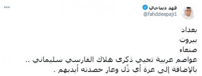 وأكد في تغريدة على حسابه بموقع التدوين المصغر تويتر، اليوم أن: "بغداد بيروت صنعاء عواصم عربية، تحيي ذكرى هلاك الفارسي سليماني، بالإضافة إلى غزة"، متسائلا: "أي ذُل وعار حصدته أيديهم".