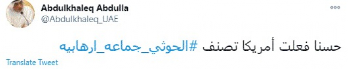 وقال في تغريدة عبر "تويتر" رصدها "المشهد العربي": "حسنا فعلت أمريكا تصنف الحوثي جماعة إرهابية".
