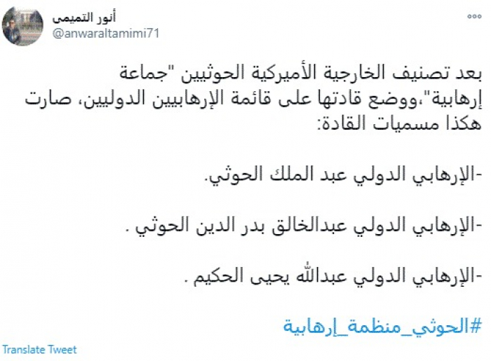 أول تعليق لـ التميمي على تصنيف أمريكا للحوثيين كمنظمة إرهابية