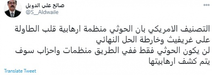 وكتب في تغريدة عبر "تويتر" رصدها "المشهد العربي": "التصنيف الأمريكي بأن الحوثي منظمة إرهابية قلب الطاولة على غريفيث وخارطة الحل النهائي لن يكون الحوثي فقط ففي الطريق منظمات وأحزاب سوف يتم كشف إرهابيتها".