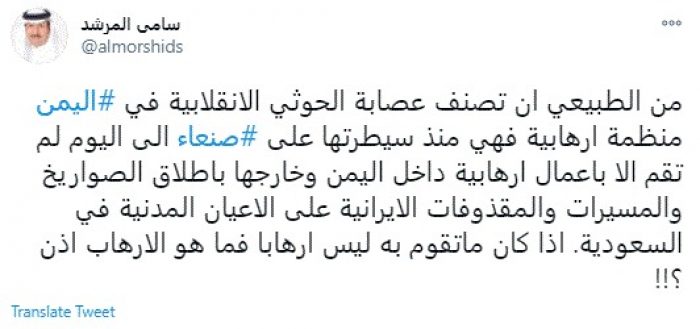 وكتب في تغريدة عبر "تويتر" رصدها "المشهد العربي": "من الطبيعي أن تصنف عصابة الحوثي الانقلابية في اليمن منظمة إرهابية فهي منذ سيطرتها على صنعاء إلى اليوم لم تقم إلا بأعمال إرهابية داخل اليمن وخارجها بإطلاق الصواريخ والمسيرات والمقذوفات الإيرانية على الأعيان المدنية في السعودية".