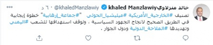 خالد منزلاوي: تصنيف الحوثيين جماعة إرهابية خطوة إيجابية