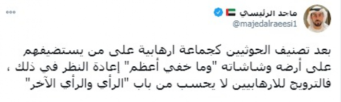 وأوضح في تغريدة على حسابه بموقع التدوين المصغر تويتر، اليوم أنه: "بعد تصنيف الحوثيين كجماعة إرهابية على من يستضيفهم على أرضه وشاشاته "وما خفي أعظم" إعادة النظر في ذلك".
