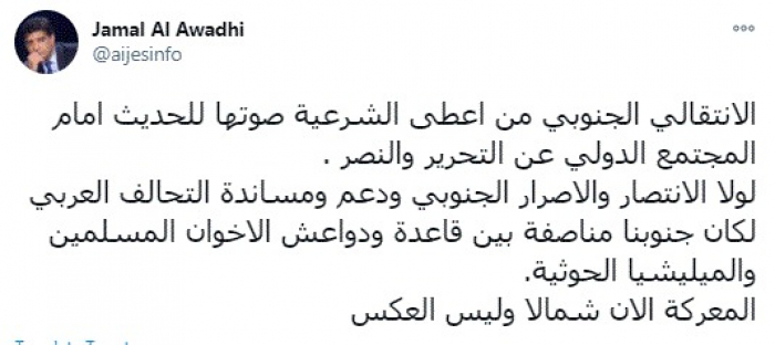 وكتب في تغريدة عبر "تويتر" رصدها "المشهد العربي": " الانتقالي الجنوبي من أعطى الشرعية صوتها للحديث أمام المجتمع الدولي عن التحرير والنصر".