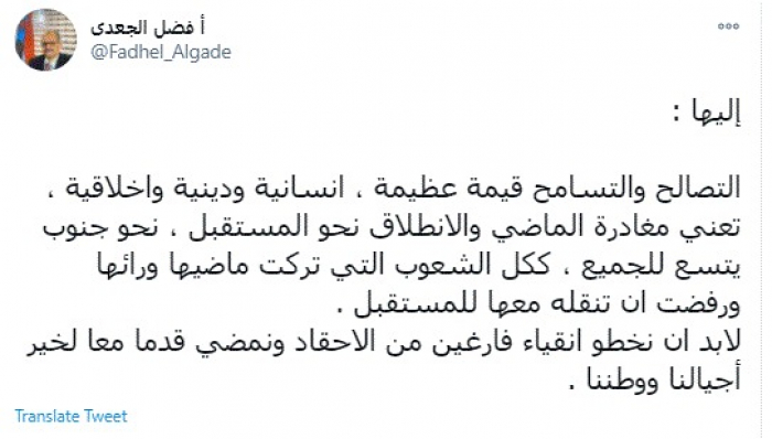 وقال في تغريدة عبر "تويتر" رصدها "المشهد العربي": "التصالح والتسامح قيمة عظيمة، إنسانية ودينية وأخلاقية، تعني مغادرة الماضي والانطلاق نحو المستقبل ، نحو جنوب يتسع للجميع، ككل الشعوب التي تركت ماضيها ورائها ورفضت ان تنقله معها للمستقبل".