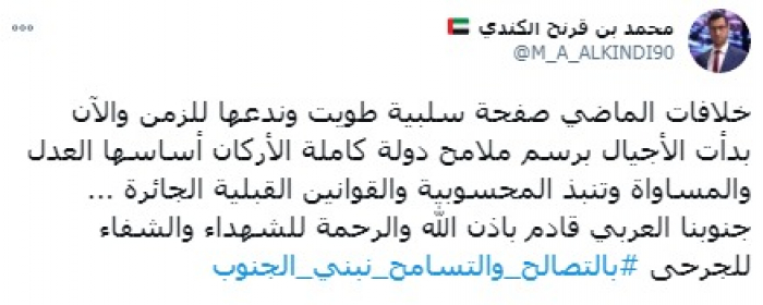 وأكد في تغريدة على حسابه بموقع التدوين المصغر تويتر، اليوم أن: "خلافات الماضي صفحة سلبية طويت وندعها للزمن".