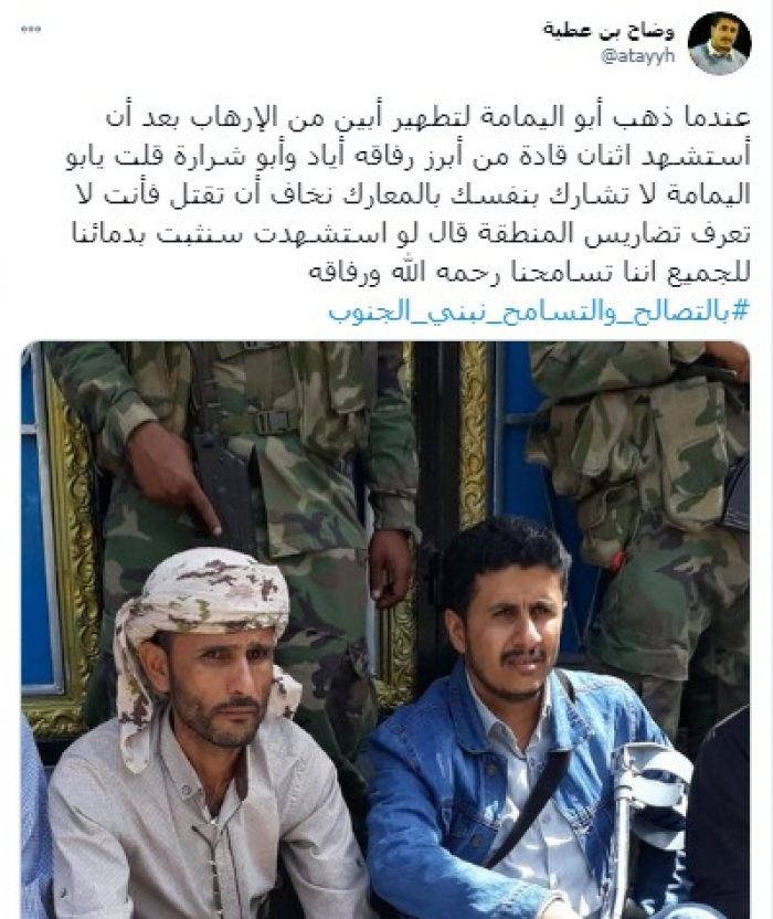 وقال في تغريدة على حسابه بموقع التدوين المصغر تويتر، اليوم إنه: "عندما ذهب أبو اليمامة لتطهير أبين من الإرهاب بعد أن استشهد اثنان قادة من أبرز رفاقه إياد وأبو شرارة، قلت يا أبو اليمامة لا تشارك بنفسك بالمعارك نخاف أن تقتل فأنت لا تعرف تضاريس المنطقة".