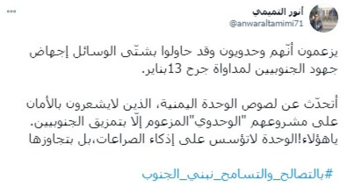 وأكد في تغريدة على حسابه بموقع التدوين المصغر تويتر، اليوم إنهم: "يزعمون أنّهم وحدويون وقد حاولوا بشتّى الوسائل إجهاض جهود الجنوبيين لمداواة جرح 13 يناير".