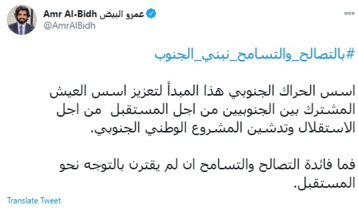 تفاعل عضو هيئة رئاسة المجلس الانتقالي الجنوبي عمرو البيض، اليوم، مع هاشتاج "بالتصالح والتسامح نبني الجنوب".
