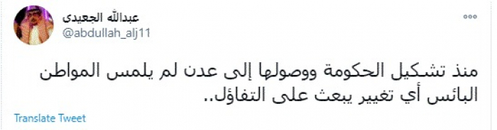 وكتب في تغريدة عبر "تويتر" رصدها "المشهد العربي": "منذ تشكيل الحكومة ووصولها إلى عدن لم يلمس المواطن البائس أي تغيير يبعث على التفاؤل".