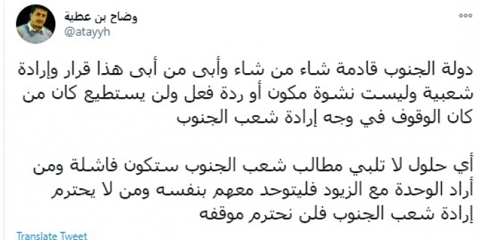 وكتب في تغريدة عبر "تويتر" رصدها "المشهد العربي": "دولة الجنوب قادمة شاء من شاء وأبى من أبى هذا قرار وإرادة شعبية وليست نشوة مكون أو ردة فعل ولن يستطيع كان من كان الوقوف في وجه إرادة شعب الجنوب".
