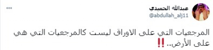 وأكد في تغريدة على حسابه بموقع التدوين المصغر تويتر، اليوم أن: "المرجعيات التي على الأوراق ليست كالمرجعيات التي هي على الأرض".